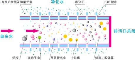 4、反滲透(RO):過濾精度在0.0001微米左右,是美國60年代初研制的一種超高精度的利用壓差的膜法分離技術(shù)?蔀V除水中的幾乎一切雜質(zhì)(包括有害的有益的),只能允許水分子通過。一般用于飲用純凈水、工業(yè)超純水、醫(yī)藥超純水的制造。反滲透技術(shù)需要加壓、加電,水的利用率低。